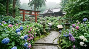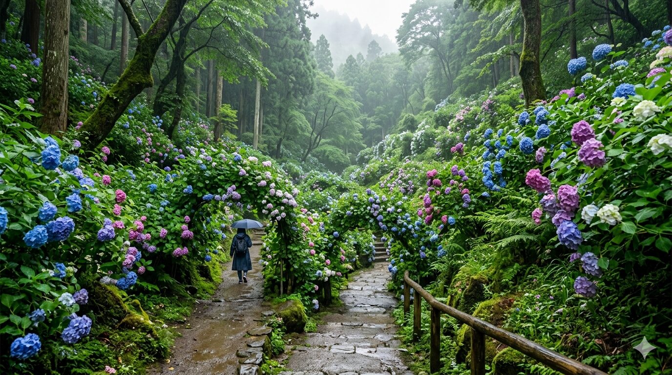 • 小雨の日はあじさいが最も美しく、来場者も少なめ。山道は滑りやすいため運動靴を着用