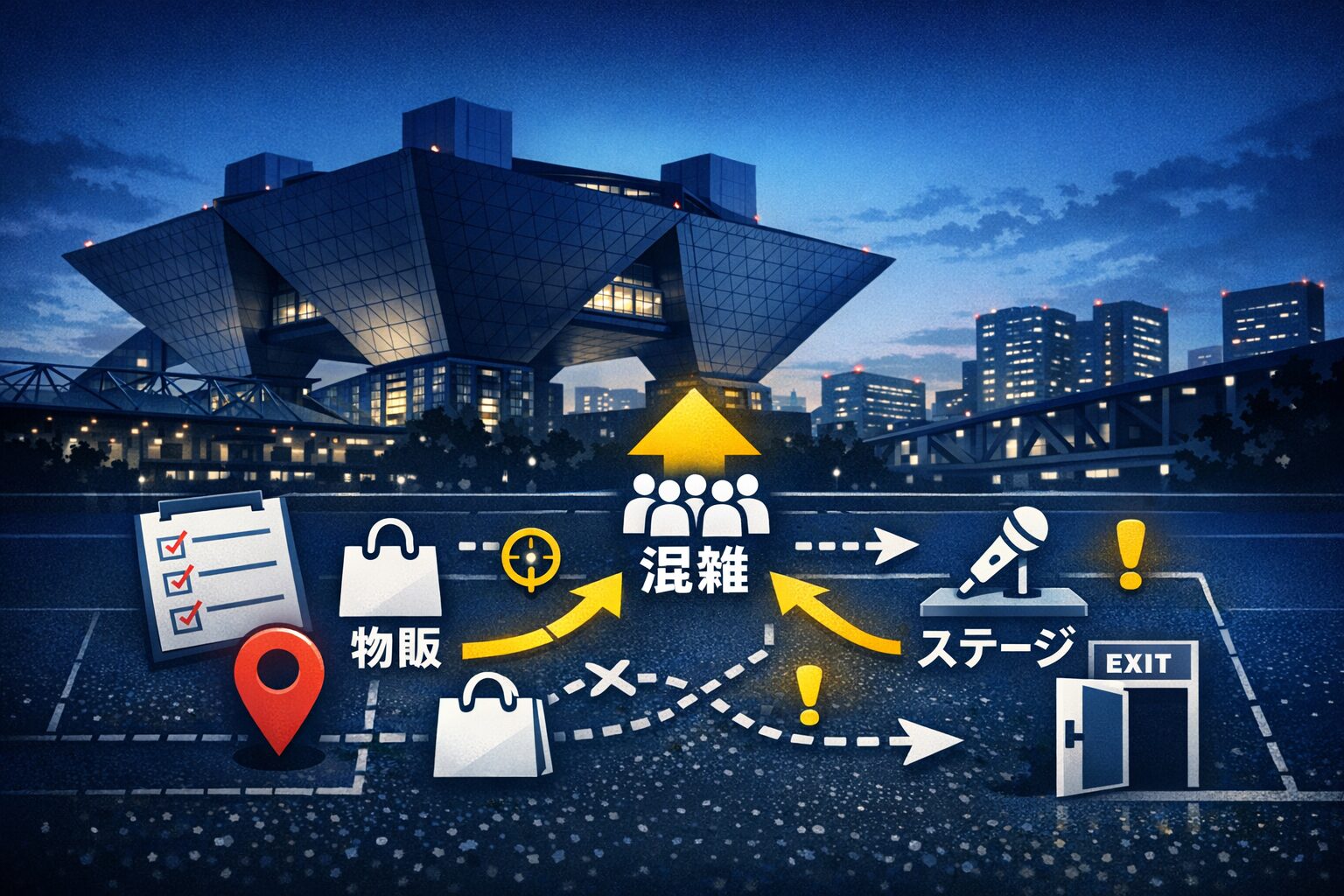 本記事では、一般公開日ビジネスデイで行動を分けつつ、並びを短くしやすい到着時間混雑しにくい導線売り切れ回避の物販ムーブ、そして飽和時に安全に抜ける撤退ルートまで、準備段階で決められることを体系化します。