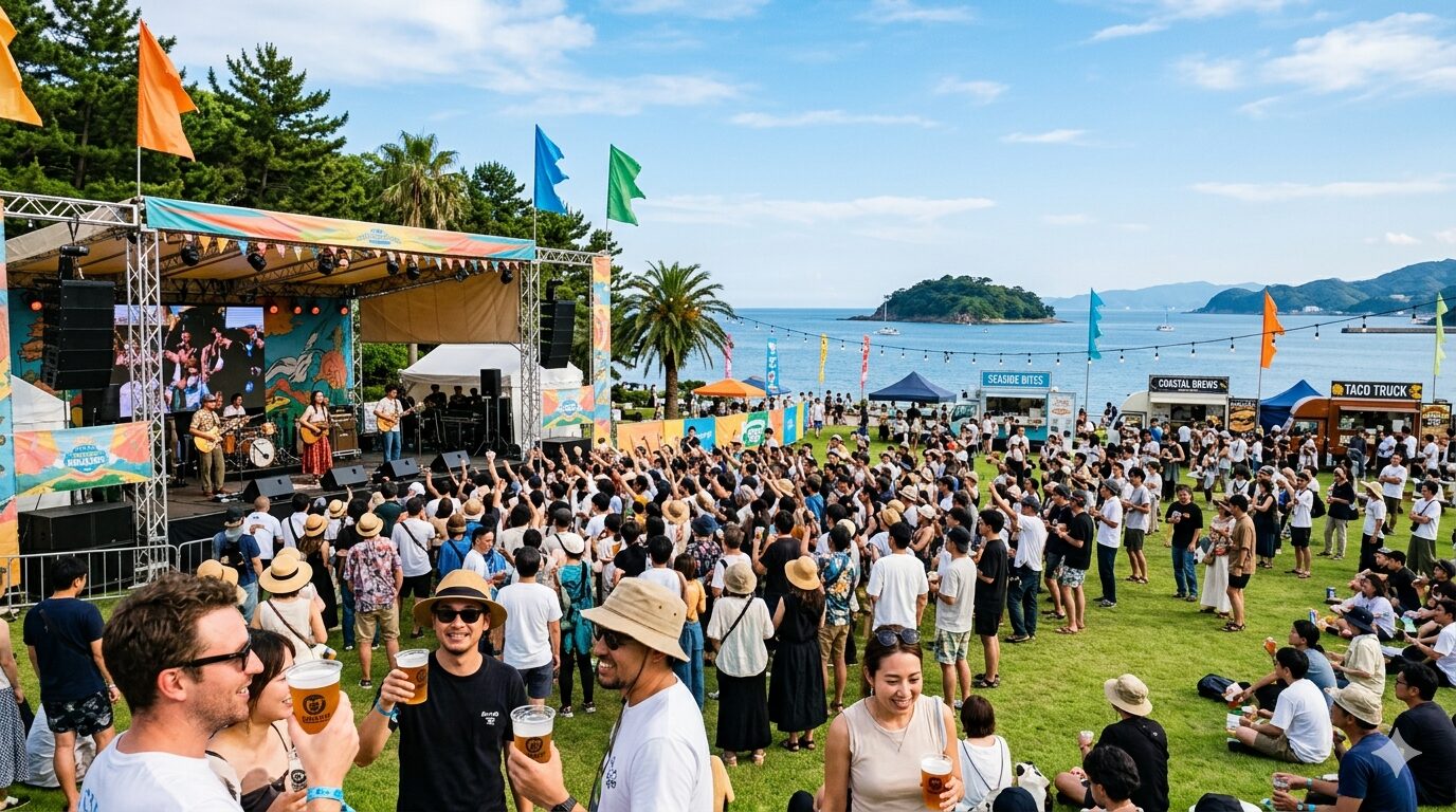 品川から京急で40分ほどで行けるうみかぜ公園が会場だよ!目の前に猿島が浮かぶ絶景の芝生広場に特設ステージが設けられて、純烈・水曜日のカンパネラ・梅田サイファーなど約70組が出演する約3週間のフェスなんだ。しかも入場は無料で、全国から厳選した20銘柄のクラフトビールが飲み比べできるのが最高なんだよ。