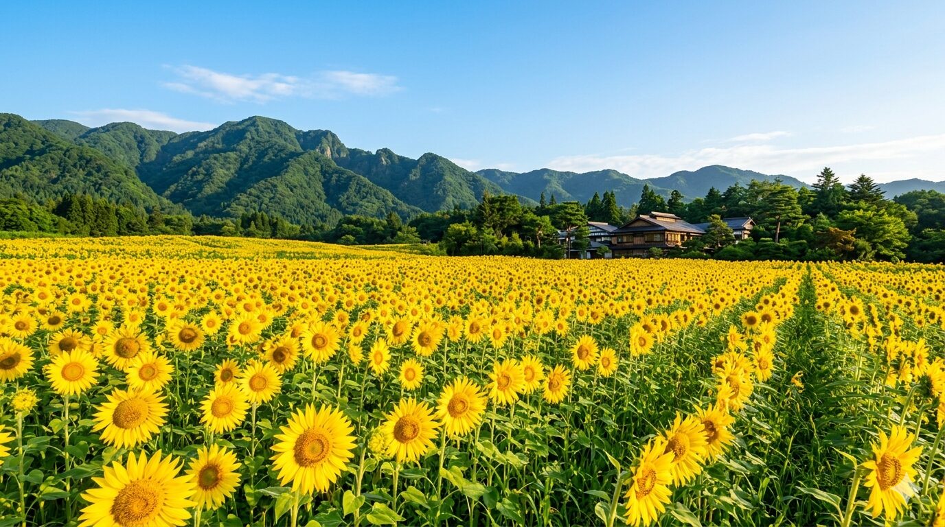 Nasu Highlands Summer Trip Guide — Nasu Highlands (Tochigi Prefecture) is a popular summer resort about 2–2.5 hours from Tokyo by car (Nasu IC via Tohoku Expressway). The area sits at 600–1,000m elevation, making it 5–8°C cooler than Tokyo in summer. The main sunflower attraction is Nasu Heartful Farm, where approximately 2 million sunflowers bloom from early to late August (admission: ¥500 for adults). For accommodation, many ryokan and resort hotels offer open-air baths and summer pool facilities — ideal for couples and families alike. Tip: visit the sunflower field in the morning for the best light and photos, and pack a light jacket for cool evenings.