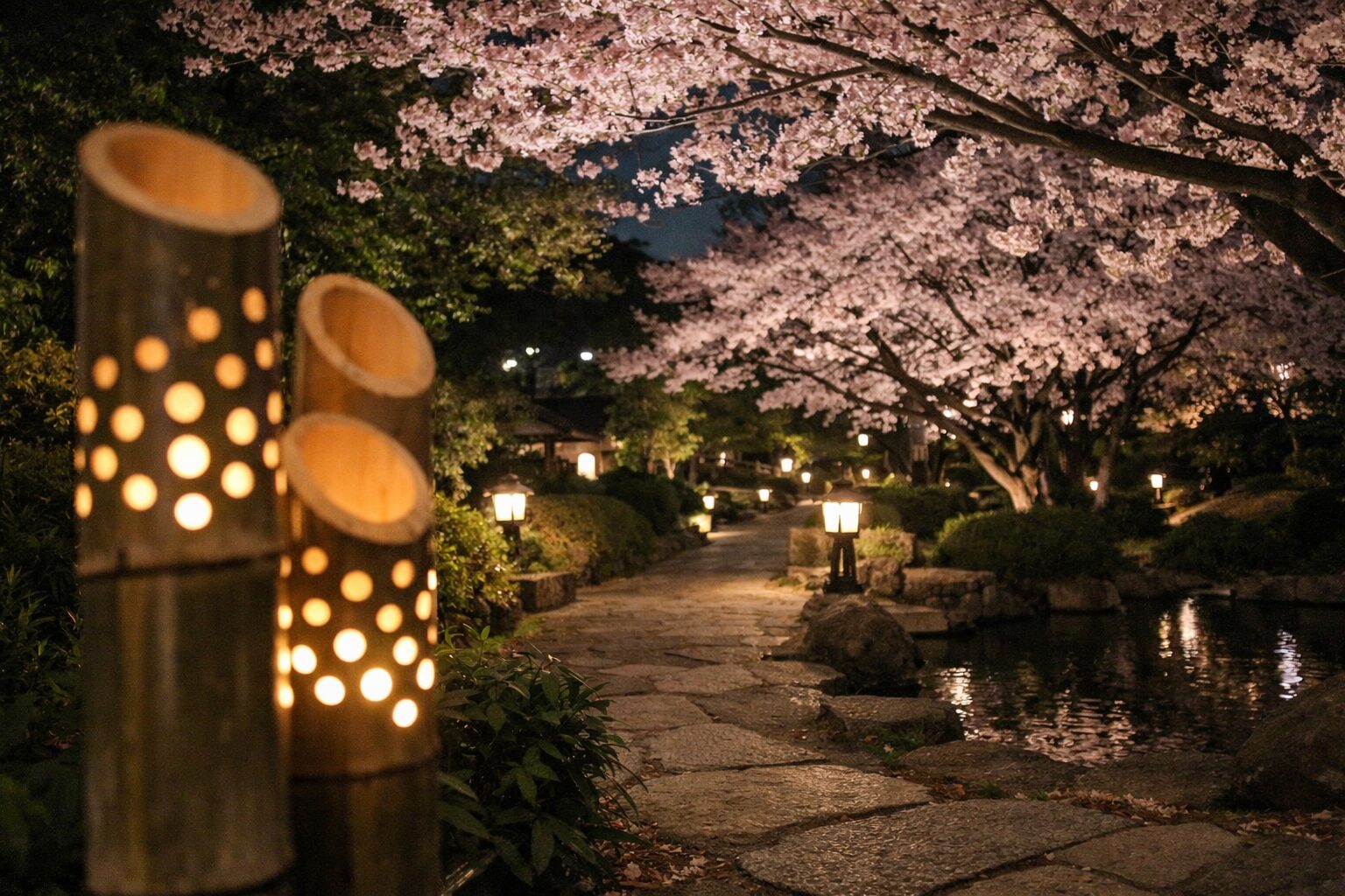 ライトアップ:夜桜+竹あかり(時間の目安は17:00〜0:00などが案内されています。最新は公式で確認)